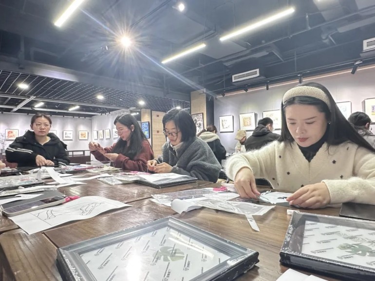 活动现场,长桌上整齐摆放着精美的宋锦面料、圆润的珍珠、专业的画框以及各式工具。与普通缝制不同,本次活动的核心在于“镶嵌”与“构图”。