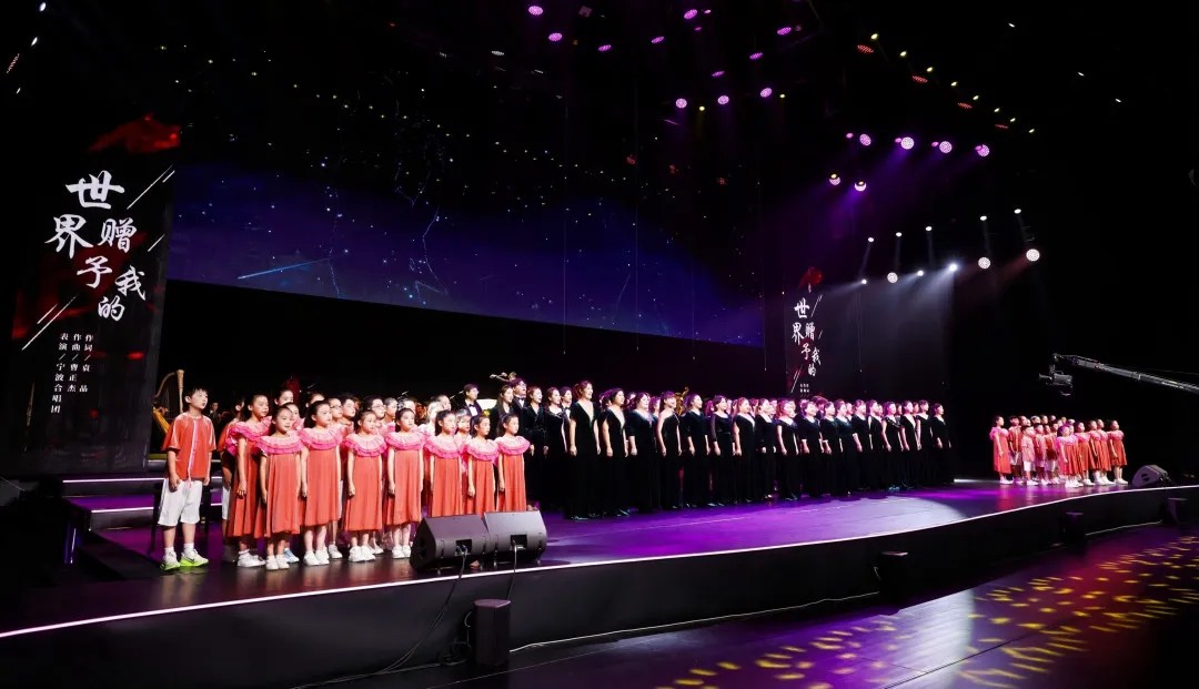 歌会匠心设计“全龄段年代金曲串烧”,以音乐为线索编织了一部生动的时代编年史。从宁波呐豆少儿合唱团纯净演绎的《让我们荡起双桨》《我爱北京天安门》,到宁波合唱团深情唱响的《我的中国心》《至少还有你》,衔接当下的《世界赠予我的》,“一首歌对应一个年代”的精准编排,唤醒了不同年龄层的集体记忆,形成了全场“沉浸式共情”的动人场面。这一设计,让金曲不仅是旋律的回响,更成为勾连家国记忆的情感纽带。