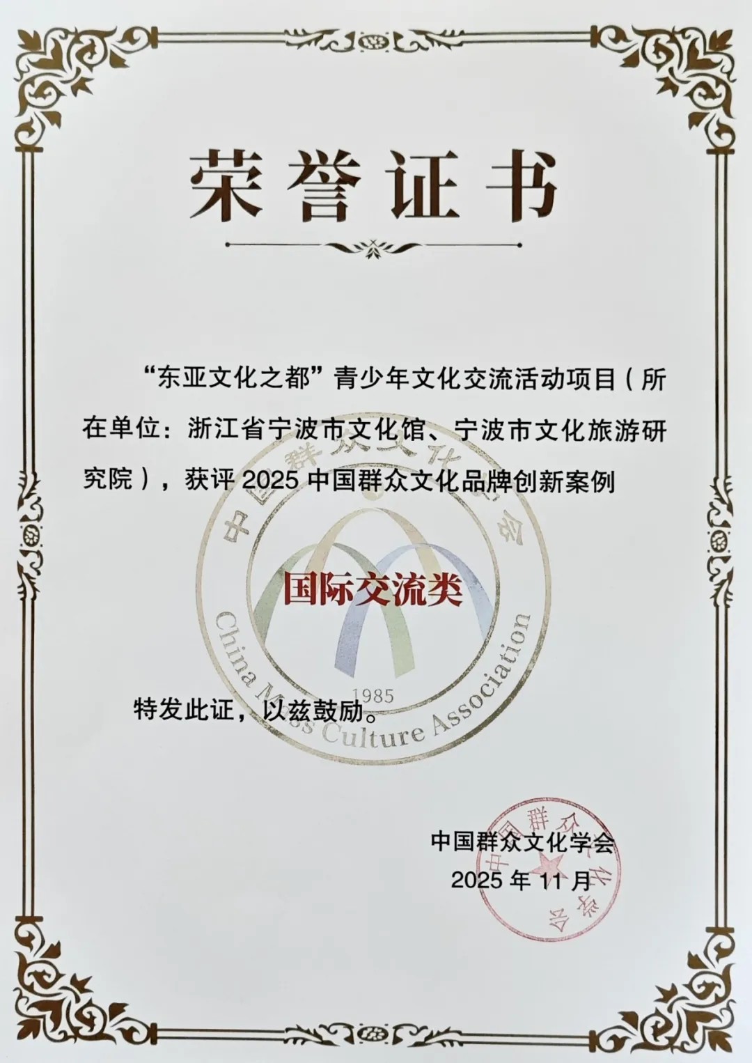 11月7日,由宁波市文化馆、宁波市文化旅游研究院联合申报的“东亚文化之都”青少年文化交流活动,成功入选2025中国群众文化品牌创新案例,成为国际交流类典型案例,彰显了我市在推动中外文化交流、促进青少年跨文化理解方面的卓越成效。
